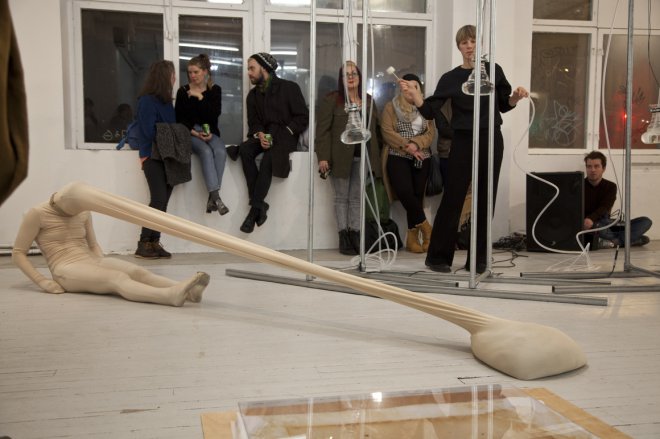 Sara Rönnbäck, Daniel Slåttnes, Andreas Oxenvad og Malin Bülow viser performance Seanser med Materialer i Vandaler Forening under Oslo Open. Her fra åpningen på Podium, 2016. (Foto: Oslo Open)