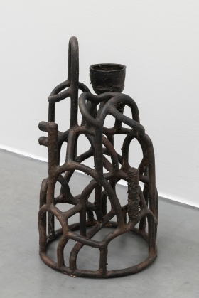 Et annet verk som fanger oppmerksomheten er et lite «bronsebur», med noe som ligner en koppholder på siden. Det organiske, ålende formspråket gir umiddelbare assosiasjoner til celler og vev, kanskje hele nervesystemet. Uttrykket i skulpturen behersker godt å balansere det noe sarte i utrykket mot det robuste, bastante materialet.