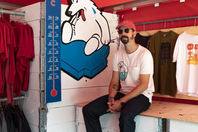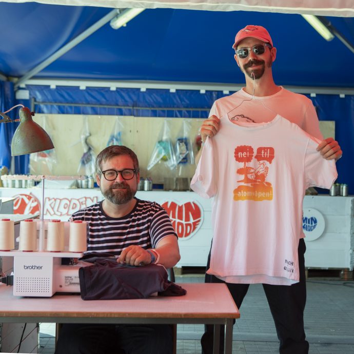 Han er årets festivalkunstner og har skapt et verksted hvor festivaldeltakerne kan trykke sine egne og unike t-skjorter med klimapolitisk budskap. Formålet er å sette fokus på overforbruket samfunnet har villet seg inn i: Forrige uke markerte vi Earth overshoot day, som markerer den dagen i året vi har brukt opp ressursene jordkloden klarer å produsere på et år, og aldri før har denne dagen kommet så tidlig.