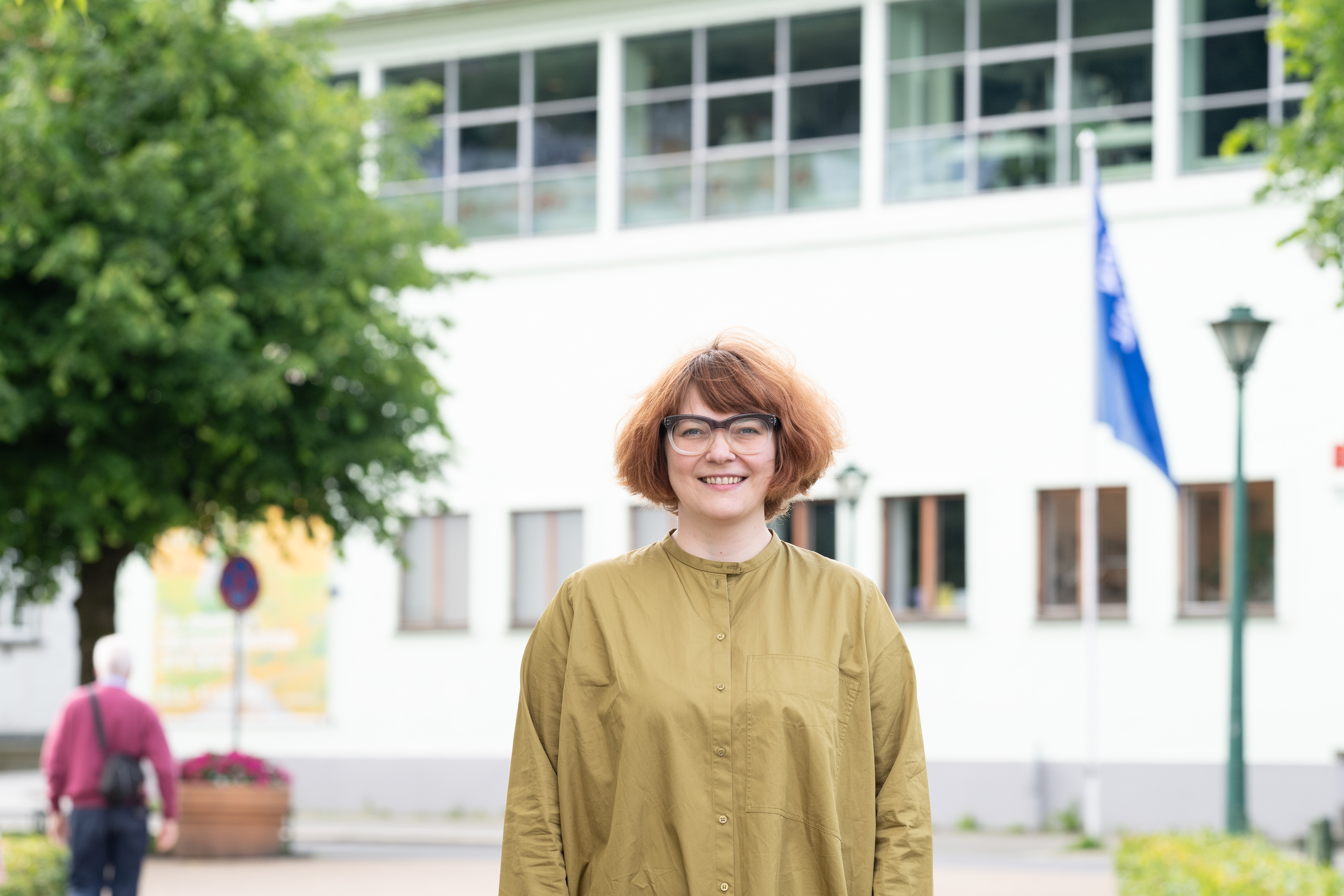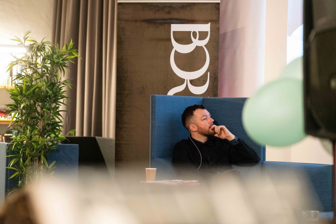 Kuratoren for Bergen Kunsthall, Maria Rusinovskaya, gir oss en siste omvisning, før vi blir med opp på et møterom med utsikt over Festplassen og Lille Lungegårdsvannet.