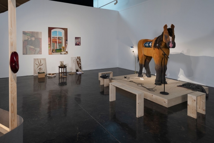 Absurditeten er gjennomgående, og det er mye i utstillingen som balanserer på en line mellom det umiddelbart fattbare, og det en kanskje ikke trenger å fatte. Et av verkene som godt favner dette er «Dance Music For A Horse That Does Not Exist» (2019) av Jo Mikkel Sjaastad Huse.