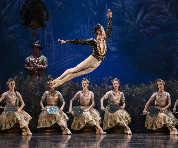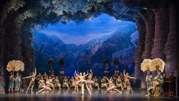 I en verden fylt med tyll, glitter og romantikk har Nasjonalballetten fått intet mindre enn den tidligere russiske prima ballerinaen, Natalia Makarova til å gjøre sin egen tolkning av eventyret «La Bayadère» fra 1980. I første akt er Operascenen totalt forvandlet til en tempelplass med gigantiske søyler i en øde, grønn skog, hvor en skimter de mørkeblå Himalaya-fjellene i bakgrunnen. På midten av scenen danser en rekke Brahminer (hinduiske prester) med håret i locs og tøyremser rundt hoftene, over den ritualistiske ilden. De ønsker prinsen Soler velkommen etter en vellykket krigsinnsats, men det eneste som fanger hans oppmerksomhet er den vakre tempeldanserinnen, Nikiya, som han lover sin kjærlighet til. Rajaen er imponert over Solor og som takk for innsatsen gir han bort sin datter, prinsesse Gamzatti.