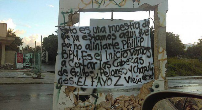 LOKALE BLOGGER har publisert bilder av et spray-malt laken oppslått i Playa Del Carmen. På det påtar et hevdet narkotikakartel seg ansvaret for volden: