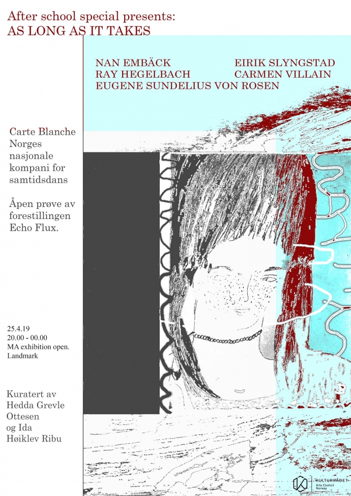 Igjen er det duket for After School Special på Landmark Bergen med «As long as it takes», kuratert av Hedda Grevle Ottesen og Ida Høiklev Ribu. Med målet om å samle artister fra ulike multidisiplinære bakgrunner, har de denne gangen samlet syv kunstnerene henholdvis fra Bergen, Stockholm og Oslo. Dette innebærer navn som Nan Embäck, Eirik Slyngstad, Carmen Villain, Eugene Sundelius von Rosen og Ray Hegelbach. I tillegg skal de huse dansekompaniet Carte Blanche med åpen prøve og utdrag fra prosessen av forestillingen «Echo Flux», som har sin urpremiere den 23. mai. Inn i nattetimene skal Dj johanistyle aka Johanne Øra Danielsen være dj.