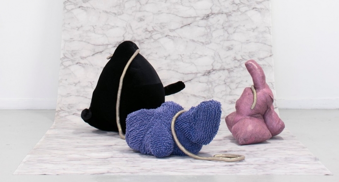 Mari Norddahl sine tekstilobjekter fremstår som noe levende og kroppslig. (Foto: Visningsrommet USF.)