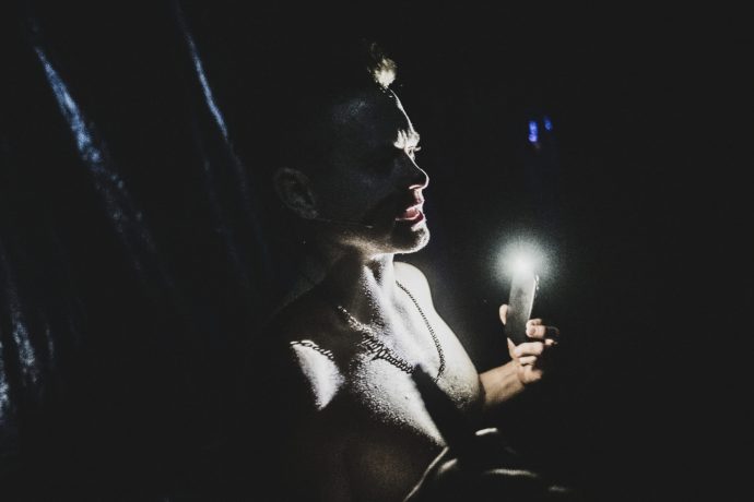 Scenen lyses utelukkene opp av skuespillernes mobil-lommelykter, og scenebildet er fremlagt nøkternt. En plastduk, hvor det skrives Rasist med rød leppestift, er hengt opp foran scenen, som projiserer et direktekringkastet webkamera, plassert bak duken. Det er friskt.