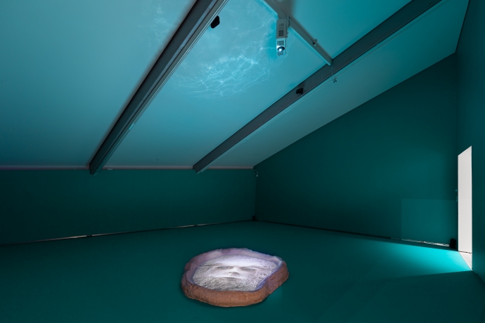 Fra rommet over gangen kan en høre det noe forunderlige lydbildet som strømmer fra Mercedes Mühleisens verk «Crust» (2018). Installasjonen, som består av en slags innendørs kulp med en video projisert i seg, trekker en inn i rommet. Videoprojeksjonen illustrerer en noe underlig antropomorf skapning på vannoverflaten. På mange måter ligner den en kombinasjon av noe fra science fiction-film og leirfigurer fra kunst og håndverk-undervisningen. Litt nervøst og vaktsomt taler den animerte skapningen nærmest i regler.