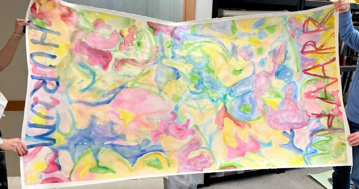Kunstneren arbeider i skiktet mellom tekstil og maleri, med reaktiv maling på silke. Resultatet er koloristisk heftig med 3D-effekt.