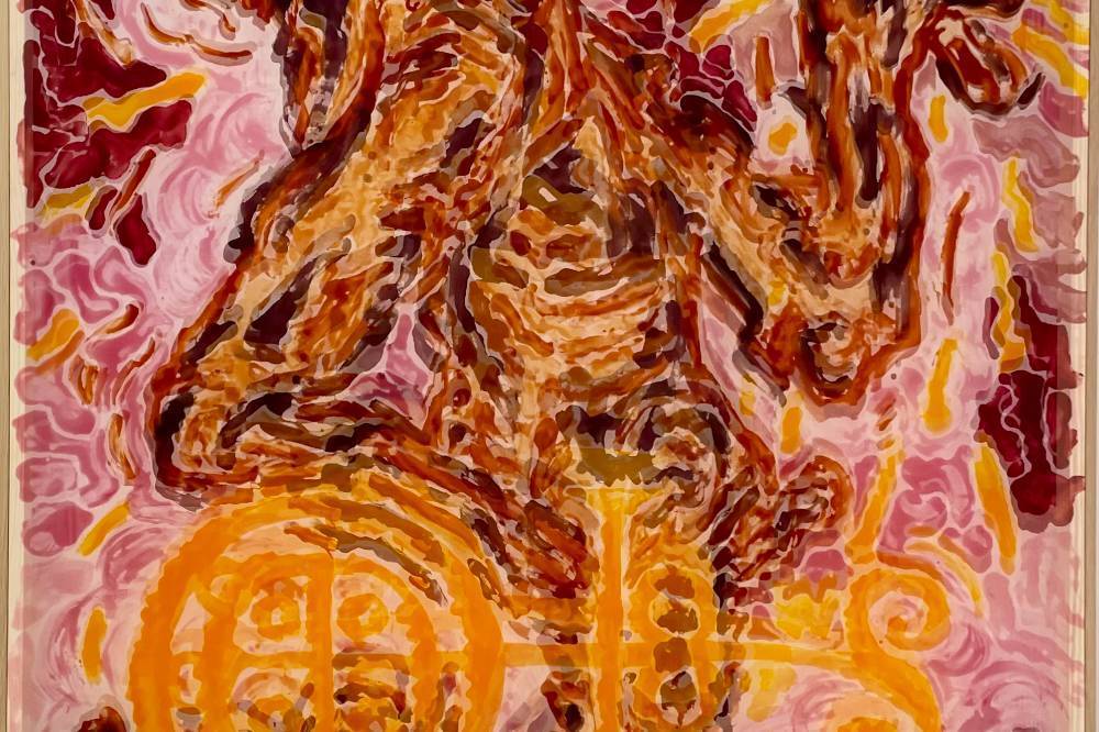 Utstillingen avsluttes med en serie lyskraftige malerier i flere lag, utført med blekk på geiteskinnspergament.