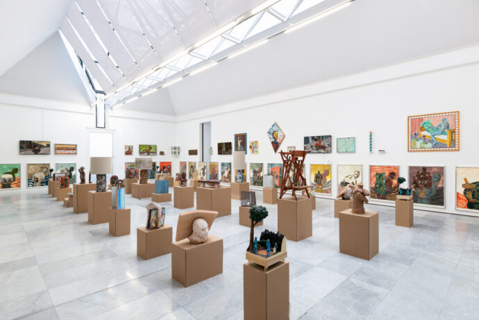 I sin prisbelønnede installasjon har Steinar Haga Kristensen brukt skulptur, maleri, grafikk og dataspill. (Foto: Susann Jamtøy/Trondheim kunstmuseum.)