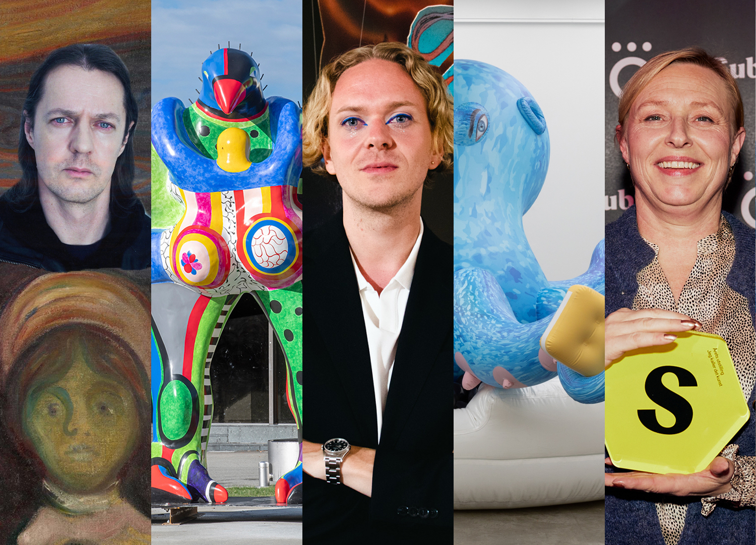 Satyricon på Munchmuseet (t.v.), Niki de Saint Phalle på Henie Onstad, Nikolai Torgersen på Fineart, «The Future is _____» på Trondheim kunstmuseum og «Jeg kaller det kunst» er blant årets store snakkiser. Sistnevnte vant Subjektprisen for Årets utstilling. (Kollasj: Subjekt.)