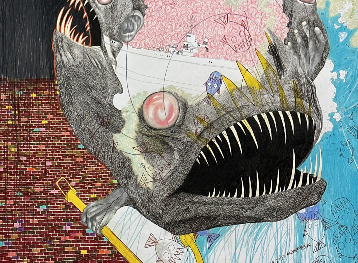Utstillingen består av en rekke tegninger som kombinerer detaljerte figurer med mer naive streker og former.