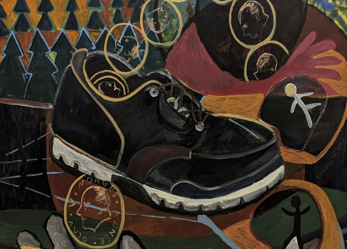 Her ser kunstneren på metaforene knyttet til nettopp sko og føtter: Vi går i hverandres fotspor, følger slekters gang og har store sko å fylle.