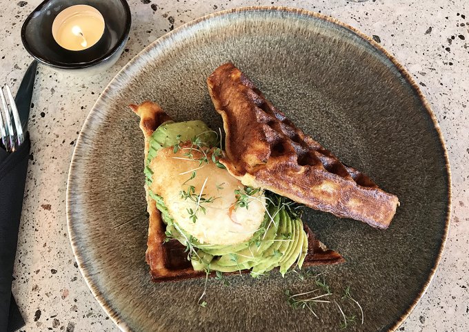 Valget faller «Belgian Chicken Waffle» med mangoketchup til kjøtteteren, og eggs benedict (med avocado i stedet for skinke) til vegetarianeren.