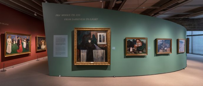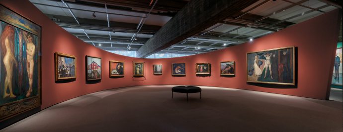 Samspillet mellom utstilling og arkitektur er interessant, nettopp fordi at rommene kan bidra til å se de mer allment kjente verkene med et nytt blikk. De buede utstillingsveggene, som slanger seg gjennom rommet, bidrar til at de ulike overskriftene og temaene glir inn i hverandre. Dette tillater i større grad å se bildene i kombinasjon med flere mulige tematiske og estetiske uttrykk. Fokuset ligger dermed ikke på enkeltverkene som enestående momenter, men som kausale sammenhenger av ulike temaer og motiver gjennom Munchs karriere.
