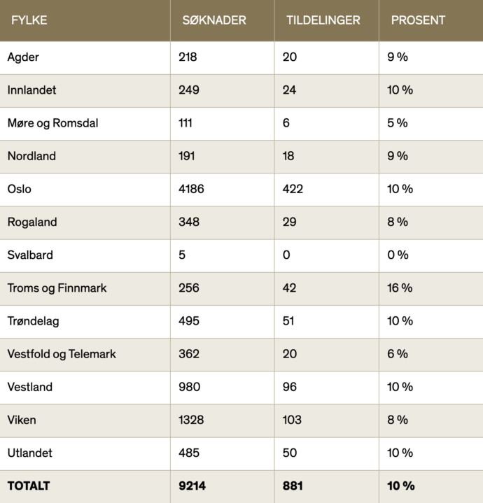 De fleste søknadene kommer fra Oslo og Viken, men det er Troms og Finnmark som har den høyeste tildelingsprosenten, der hele 16 prosent av søknadene har blitt innvilget.