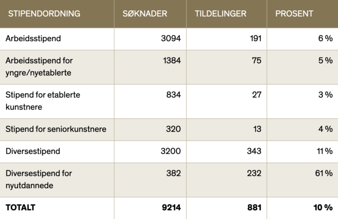 – Det har vært en spesiell tildelingsrunde med tanke på den akutte krisen i den norske kultursektoren. Det gjør at denne grunnmuren i norsk kunstnerøkonomi blir desto viktigere, sier hun.