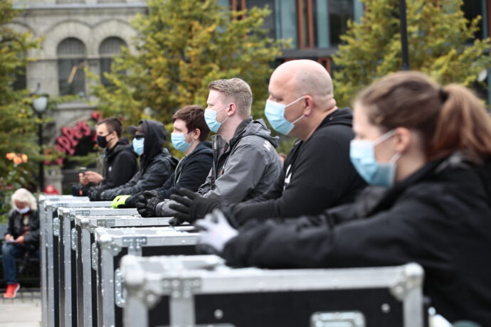 Iført munnbind og på en meters avstand viste sceneteknikerne hva de er gode for. En så vel produsert demonstrasjon skal en se lenge etter. På så måte demonstrerte de også hvilken kompetanse de har for å koordinere trygge arrangementer.