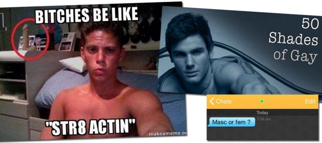Spørsmålet om “de egentlige ofrene” fører av nødvendighet med seg en avgrensning, ikke alle kan ha det verst, og Agledahl tegner opp grensene når han litt klumsete ender opp med å ta avstand fra homser som er “femi, svak[e], ræva i fotball, promiskuøs[e] – kanskje til og med ekkel[e] og unaturlig[e].” Det virker som om han undertrykkes dobbelt opp; det er ikke bare hver fjerde mann som gjør livet vanskelig, men også alle de dumme homsene som puler rundt, ikke kan treffe en fotball, som hviner og hyler til Melodi Grand Prix, og som i følge Agledahl definerer hva en homo er.