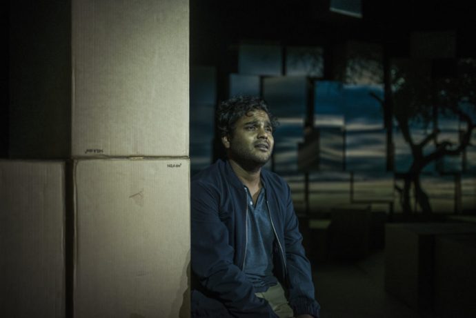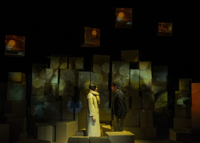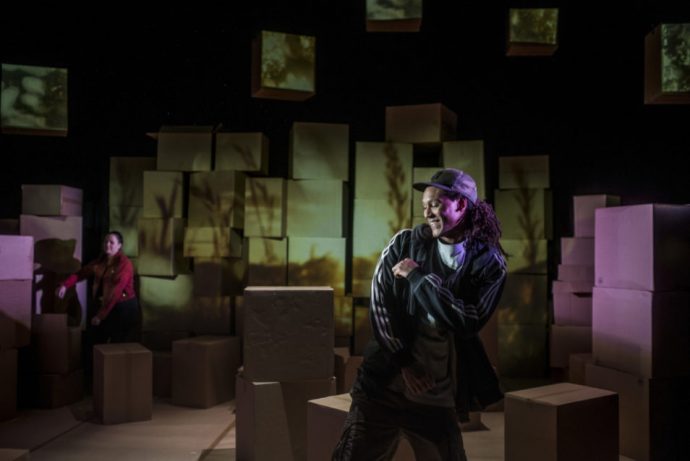 Scenen er omringet av det som symboliserer pappesker, som skuespillerne bruker til å skape høyblokker, gatehjørner og t-banestopp. Det er ikke et nytt grep, vi har blant annet sett det før i «Antichrist» (2012), «Blokk til blokk» (2018) og så nylig i «Ein av oss» (2019). Eskene fungerer også som lerret for videokunst skapt av Simon Valentine. I seg selv kan dette fungere veldig bra, men i praksis er utførelsen rotete, og regien føles ukontrollert.