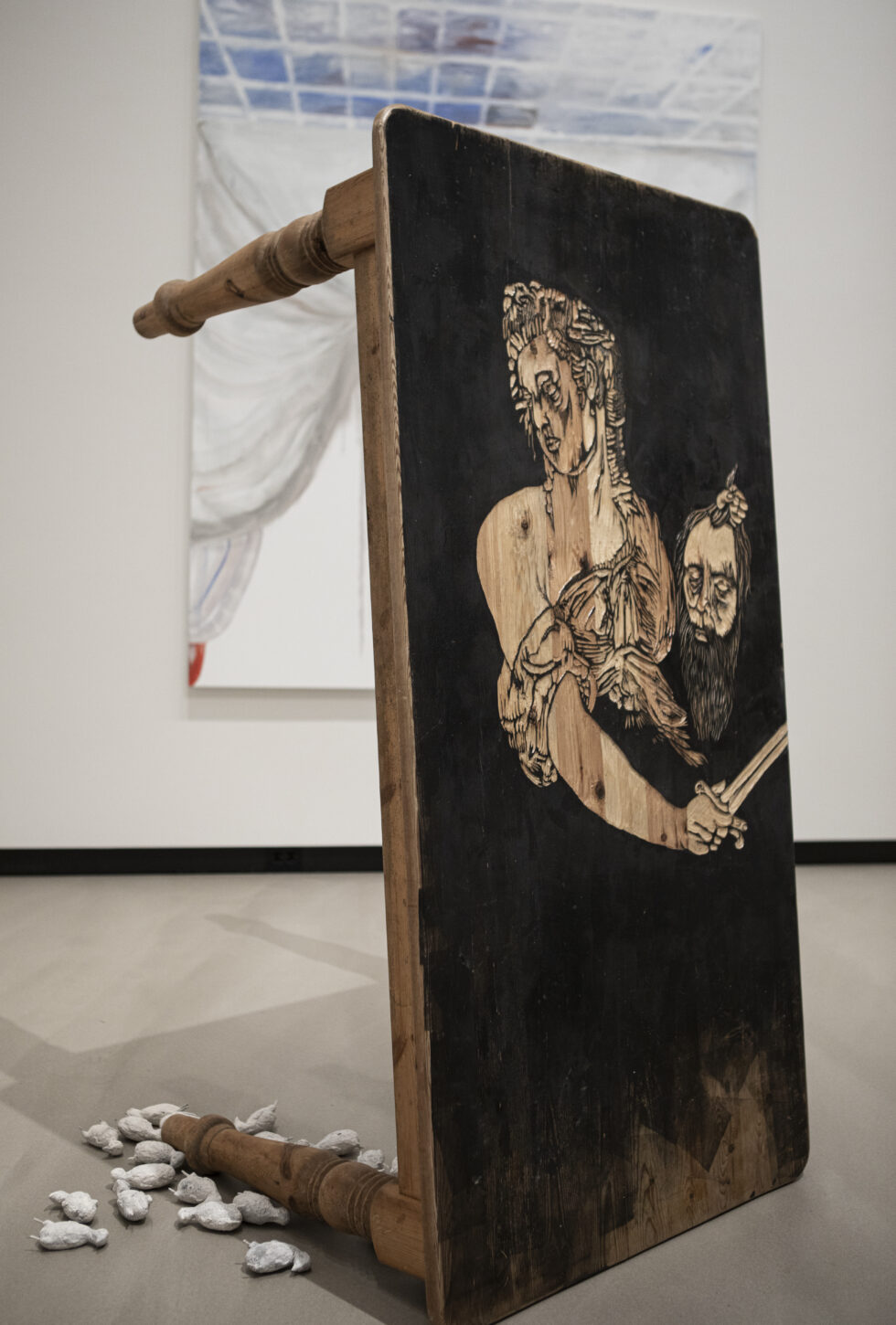Julie Ebbings verk «Judith og Holofernes», et tresnitt utført på et bord, blir å se på Kuk i Trondheim fra og med 25. mars. (Foto: Dag Asle Langø.)