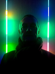 Per Hess foran eget lysrør-verk på Galleri Lynx i 2015.