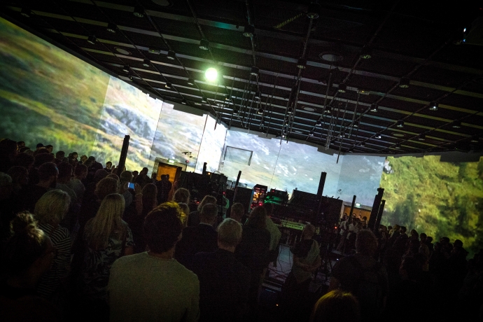 En lang kø har rukket å formere seg utenfor «Studio», Henie Onstads utstillings- og konserthall. I det de åpner dørene klokken åtte, er det første vi biter oss merke i, at dette slett ikke kommer til å bli noe LED-show. 40 lyskolber med LED-teknologi henger riktignok ned fra taket, men det visuelle her drives for det meste av projisering i rommets mangekantede formasjon. Ti hjørner, for å være presis, der bilder av norsk natur utspiller seg i 360, til Lindstrøms introduserende ambience, som inviterer de heldige inn.