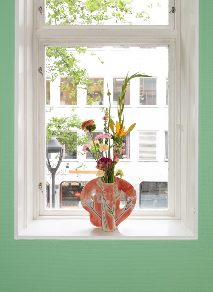 En frodig forekomst av fargerike blomster og planter pryder vinduskarmene på visningsrommet Kunstnerforbundet i Oslo. De vokser ut fra et like bredt spekter av keramiske vaser; runde som horisontale, snirklete som stumpete og glasserte i jord- og pastellfarger.