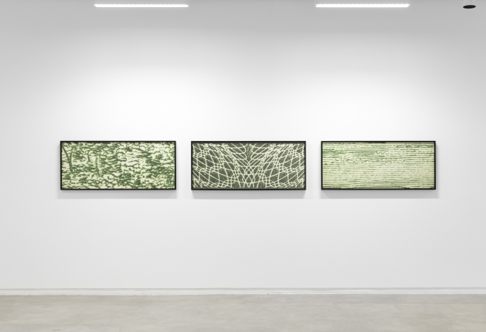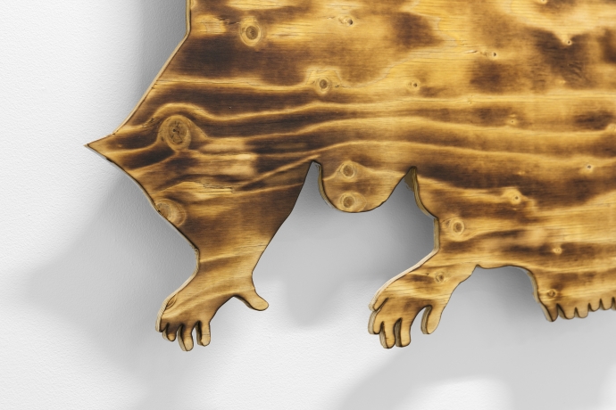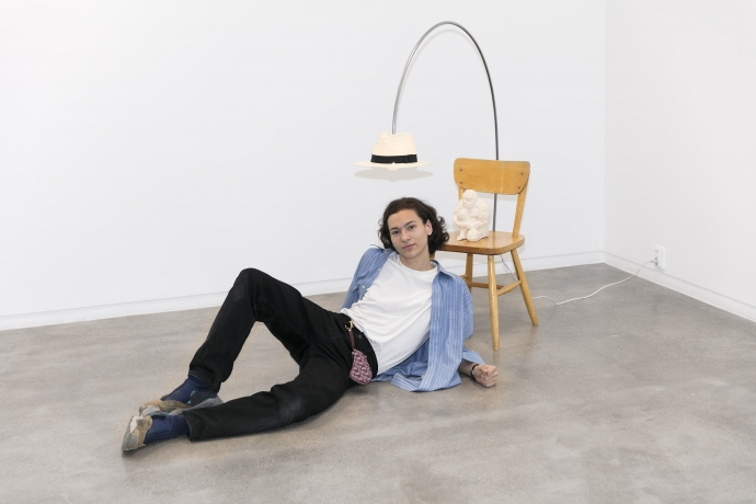Vi får ham til slutt på kroken. Han viser oss endelig rundt. Akkurat nå om faren sin, Marius Wang, som er en del av utstillingen. Videre om Matias Faldbakken og Matias Kiil. Tori Wrånes. Det stopper opp når han ber Ida Ekblad finnet et annet verk, fordi han ikke var fornøyd med det første.
