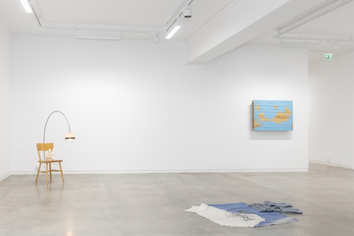 På gulvet ligger et verk av den Berlinbiennalen-utsolgte norske kunstneren Herman Mbamba. Instagramfavoritten Charlie Roberts maler og høvler på en eller annen skulptur, mens i det innerste lille rommet, som var tiltenkt noe merch Inti skulle lage for Roberts, har blitt dekket av klær, foreløpig – eller kanskje endelig – på gulvet.