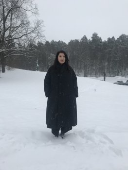 Marina Abramovic i hvit snø utenfor Henie Onstad Kunstsenter. (Foto: Danby Choi.)