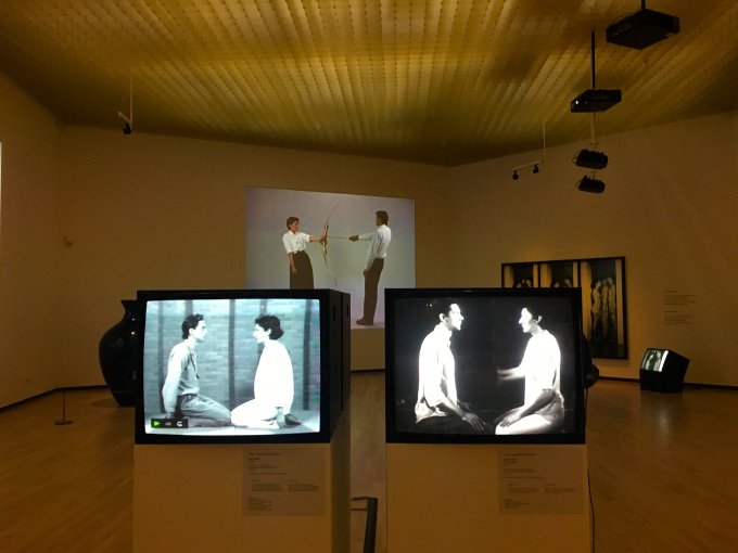 I høyre del av bildet vises en projeksjon av film fra performancen «Rhythm 0» hvor Marina Abramovic fik en pistol rettet mot hodet. Foran projeksjonen står bordet med de 72 objektene som Marina Abramovic la frem i 1974. (Foto: Danby Choi.)