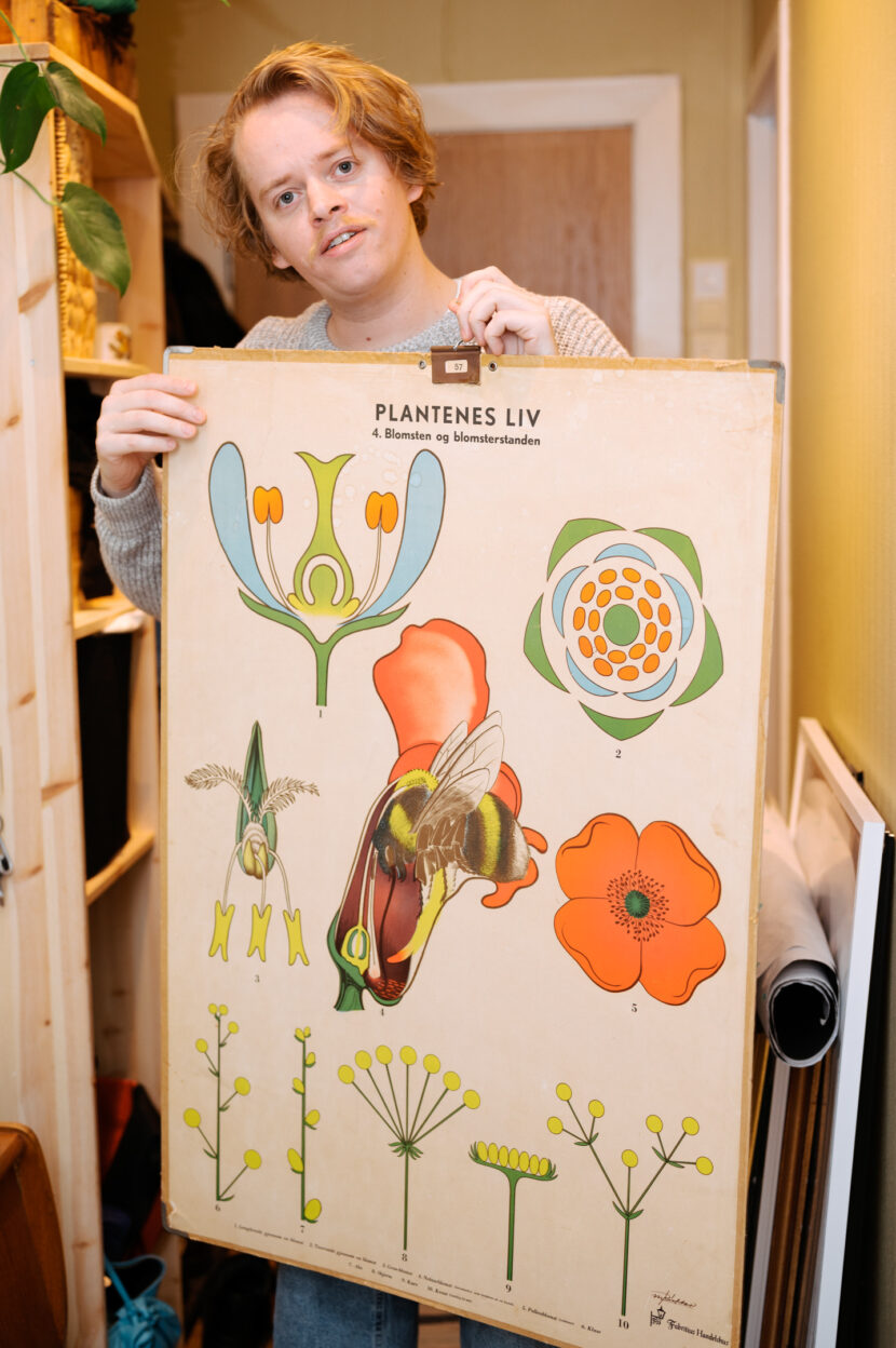 Han bøyer seg ned i gangen og plukker opp en annen plakat. Denne er også dyreinspirert, med tittelen «Plantenes liv».