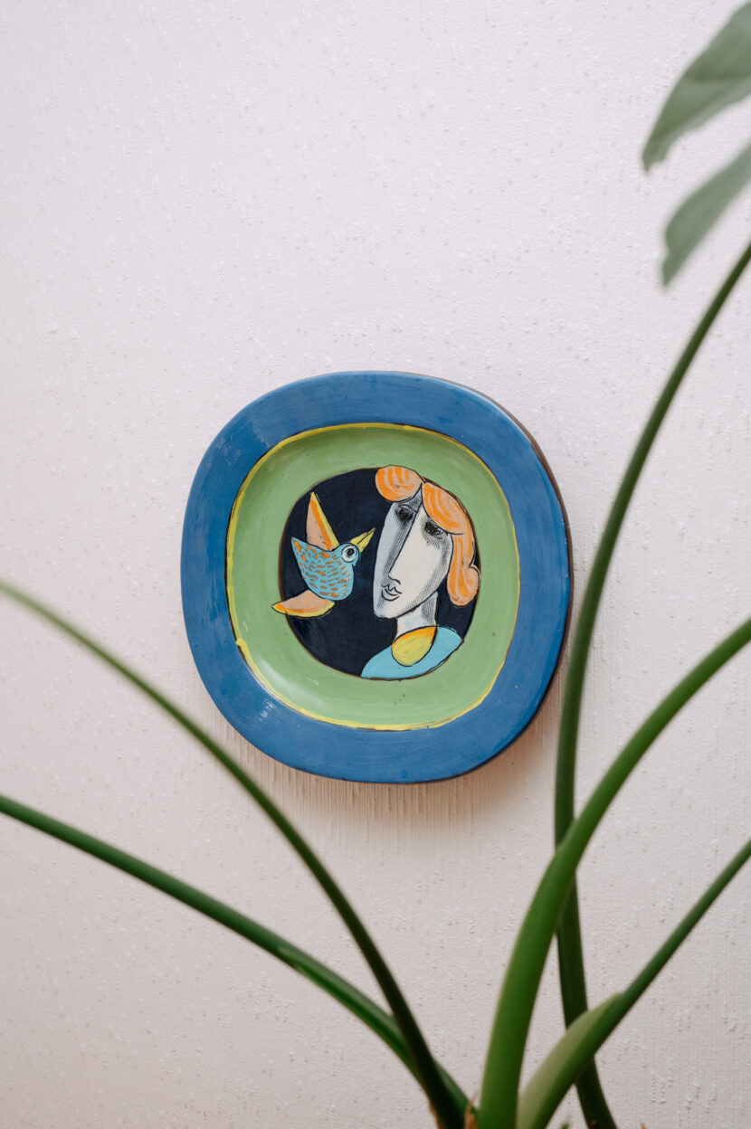 Han ser seg rundt i stuen, og plasserer blikket på et fat som henger på veggen ved siden av en plante.