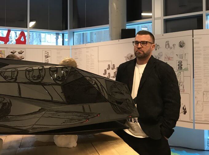 Bjarne Melgaard med en modell av «A House to Die in» på Selvaags presentasjon av prosjektet i februar i fjor. (Foto: Danby Choi.)