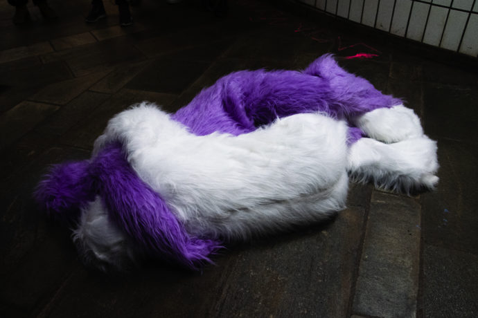 Victoria Alstrup (25) og medstudent i egne kostymer under performance på Nationaltheatret T-banestasjon, som del av kurset «Speech-based performance». Studentene er hverandres publikum. (Foto: Brage Sunde.)