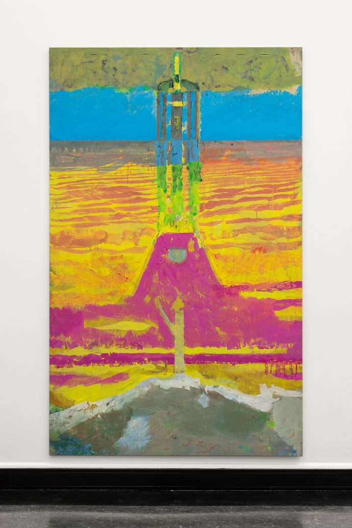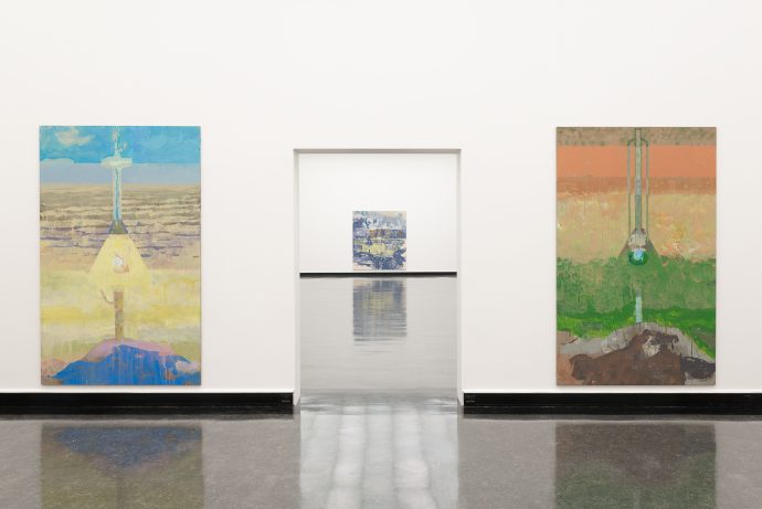 Den første salen vi ledes inn i er omringet av seks store malerier med sterke farger. Et repeterende element er fremtredende i alle verkene. De viser det samme motivet, men motivene er samtidig oppløst og forenklet. «Lanterne 3» ble malt i 2018 og er et av de første maleriene som fanger blikket vårt.