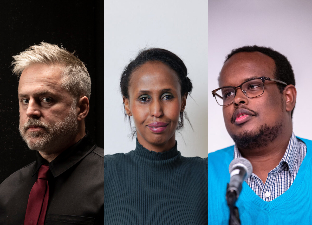 Morten Traavik, Kadra Yusuf og Mohamed Abdi skulle egentlig møtes til debatt på lørdag. Slik blir det ikke. (Kollasj: Subjekt.)