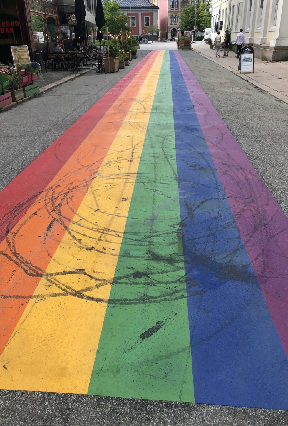 Etter at lokale ungdommer angrep regnbuegaten med sparkesykler, fremstår den som et slags ekspresjonistisk, konseptuelt kunstverk med hentydninger til samtidens ideologiske kaos. Faktisk kan det tenkes at vandalismen er bevaringsverdig som kulturelt uttrykk, skriver Pål-Henrik Hagen (Foto: Pål-Henrik Hagen.)