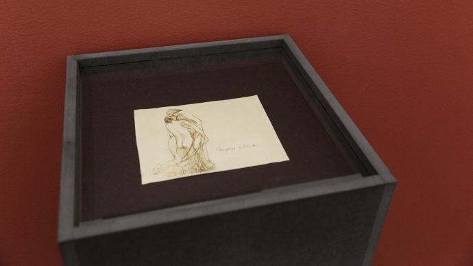 På innsiden står det lille utvalget av åtte tegninger, plassert under glass i monter, langs veggene. Over dem henger tekstutdrag fra brev som Vigeland skrev til sin mesén, Sophus Larpent, da han var på studiereise og lærte om gotikken. Disse tekstene reflekterer tegningene i liten grad – de skaper heller en humoristisk og absurd kontrast, som gjør opplevelsen langt mer morsom enn tegningene godt bevart i montre egentlig skulle klare å uttrykke alene.