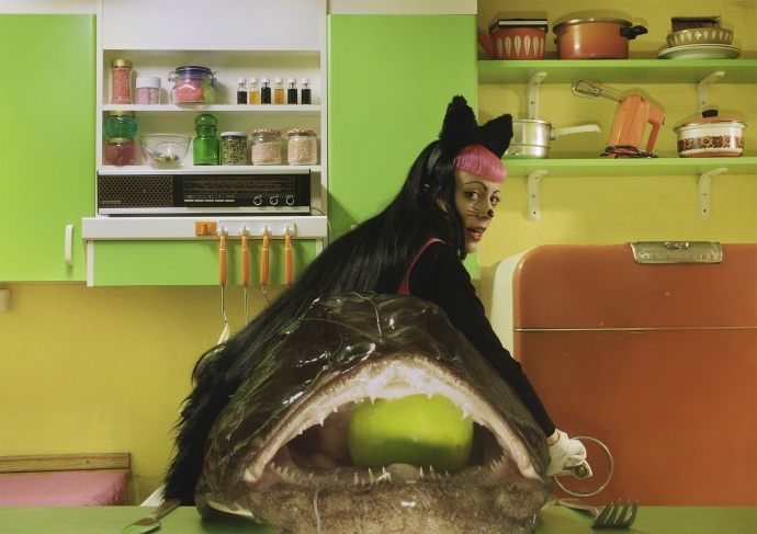 – Samtidig representerer rekvisittene ting som dominerer i sosiale bildestrømmer, som statussymboler og så videre. I likhet med lykketrollet er fotoprintene 1:1, i menneskestørrelse.