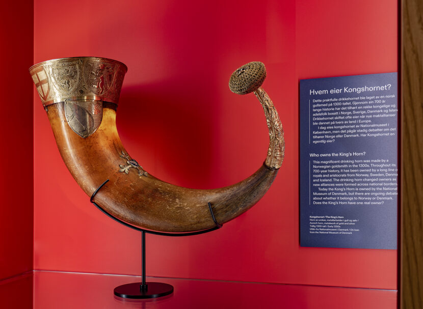 Kongshornet er et storslått drikkehorn som har tilhørt en rekke kongelige og adelsfolk i Norge, Sverige, Danmark og Island. Det ble laget av en norsk gullsmed på 1300-tallet. Kongshornet er lånt av Nationalmuseet i København. (Foto: Lill-Ann Chepstow Lusty/KHM.)