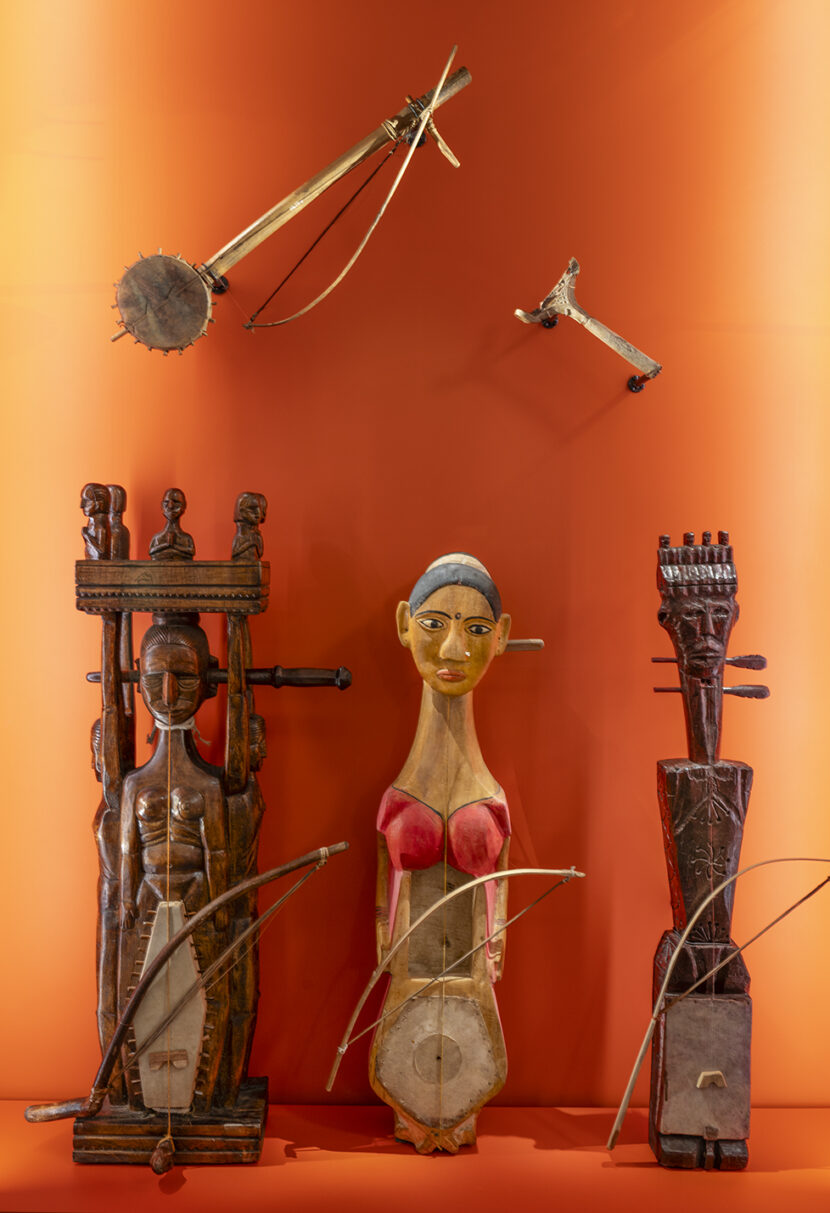 Arvens klang: Musikkarven fra Santalfolket og den samiske joiken. Museet bevarer og deler tradisjonelle instrumenter som disse Banam-strengeinstrumentene fra Santal i India, og en sjelden samisk trommehammer fra Middelalderen som ble funnet på Myklebostad, Nordland. (Foto: Lill-Ann Chepstow Lusty/KHM.)