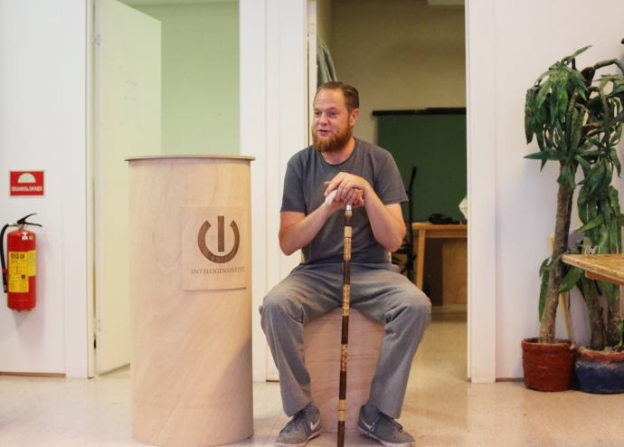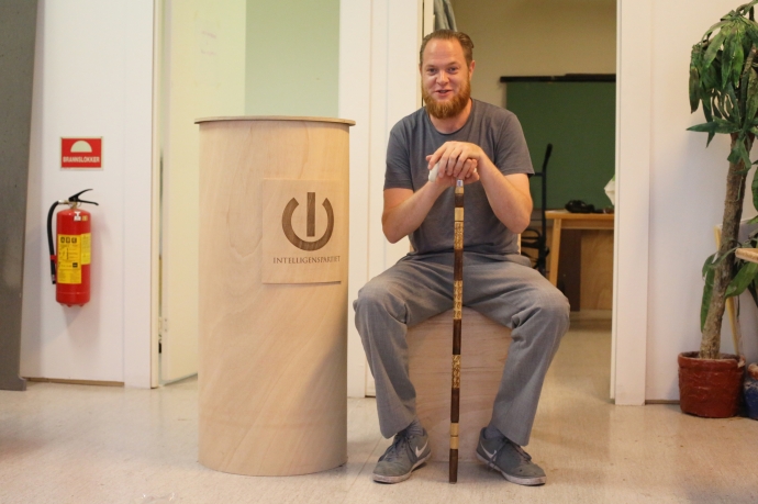 Nå gjør han det igjen, og som leder av det nye og minst like politisk fulladde kunstprosjekt «Intelligenspartiet». Ved partiets hovedkontorer over Brun og Blid i Storgata, på kanskje årets varmeste dag, møter vi kunstner og partileder Lars Cuzner for en samtale i hans atelier.