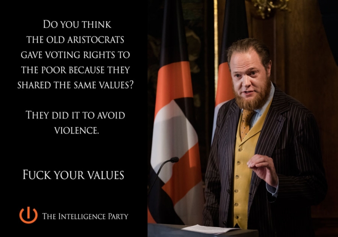 Kunstverkets tittel, «Intelligenspartiet», er hentet fra et av Norges eldste partier opprettet av Johan Sebastian Welhaven i 1830-årene. Gjenfødt i dag, appellerer partiet til kulturproteksjonister over hele Europa, for å fremme den viktigste rettigheten av dem alle, vil han og mange mene: Stemmeretten.
