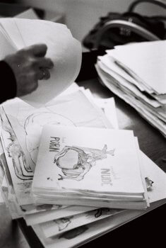 Nicolaisen viser frem noen av sine tegninger i atelieret. (foto: Julia Kidder.)