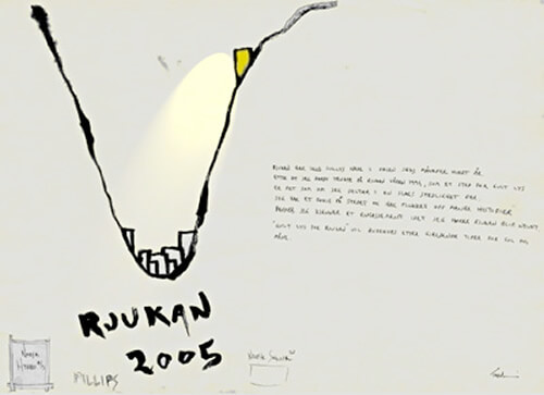 «Proposal» for Rjukan i 2005. Allerede i 1994 foreslo Nicolaisen å installere en stor lampe på den ene dalsiden – nesten 20 år før dalbyen fikk det ikoniske solspeilet. (foto: Terje Nicolaisen.)