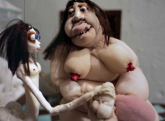 Man kan ikke la være å tenke at dette minner om porno. Samtidig er det noe barnslig ved det hele – plastelinafigurene minner om barne-tv-karakterer som Plipp, Plopp og Plomma. Mismatchen er ubehagelig.