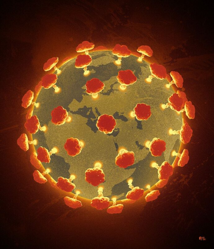 Blooms tegning «World War C» viser koronaviruset som en jordklode, hvor virusets såkalte spikeproteiner er erstattet med atombomber.