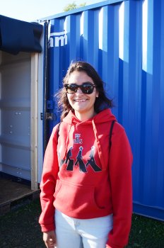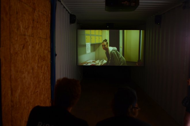 Vi går inn, og ser deler av den 45 minutter lange filmen. Under oppholdet er det bare vi og to Øya-frivillige i containeren, og ei jente som stikker hodet inn et par sekunder, før hun går ut igjen. Vi springer etter og huker tak i studenten Daniella (18).
